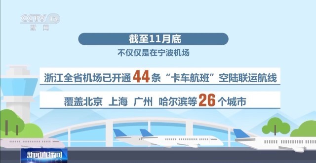 不仅仅是在宁波机场,截至11月底,浙江全省机场已开通44条“卡车航班”空陆联运航线,覆盖北京、上海、广州、哈尔滨等26个城市。同时,空空中转、空海联运等“空-海-陆”一体化、可按需组装的多式联运服务体系正在加速形成。
